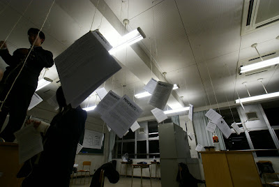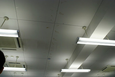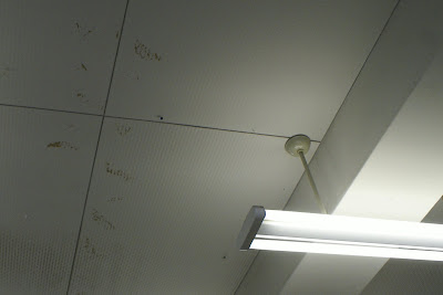 この教室は我らが広報委員会が展示で使っており、歴代生徒会報を天井から吊るという大胆なエクシビションに挑戦していました。その会報を釣るビニールひもを止めていたのが画鋲たち。展示の撤収の際には無造作にひもを引くことで取り外したつもりになっていたので、天井に刺さったまま半年を過ごすことになったものと思われます。ご苦労様でした。